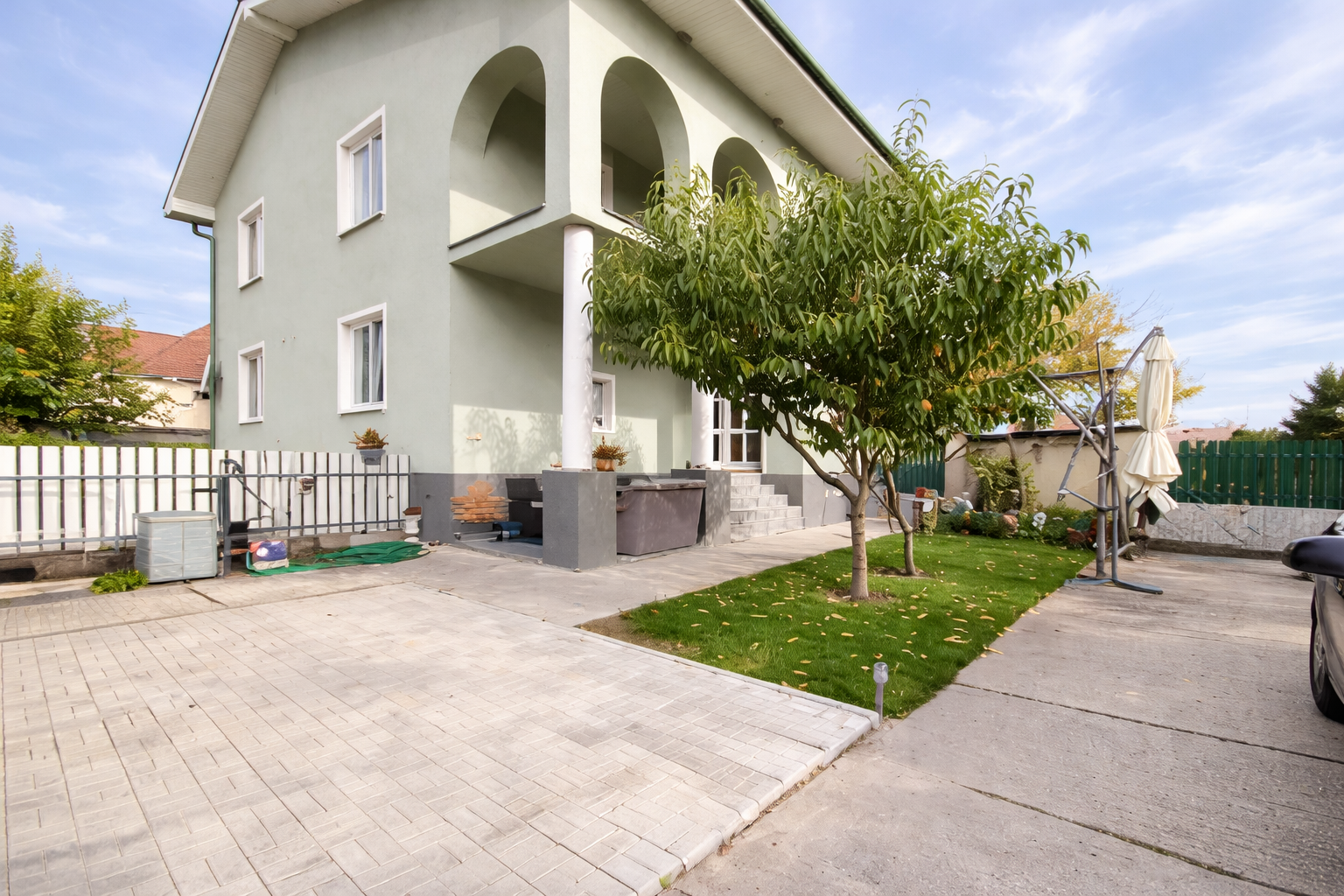 Pozemok je oplotený, parkovanie je možné pred domom alebo priamo na pozemku pri dome.