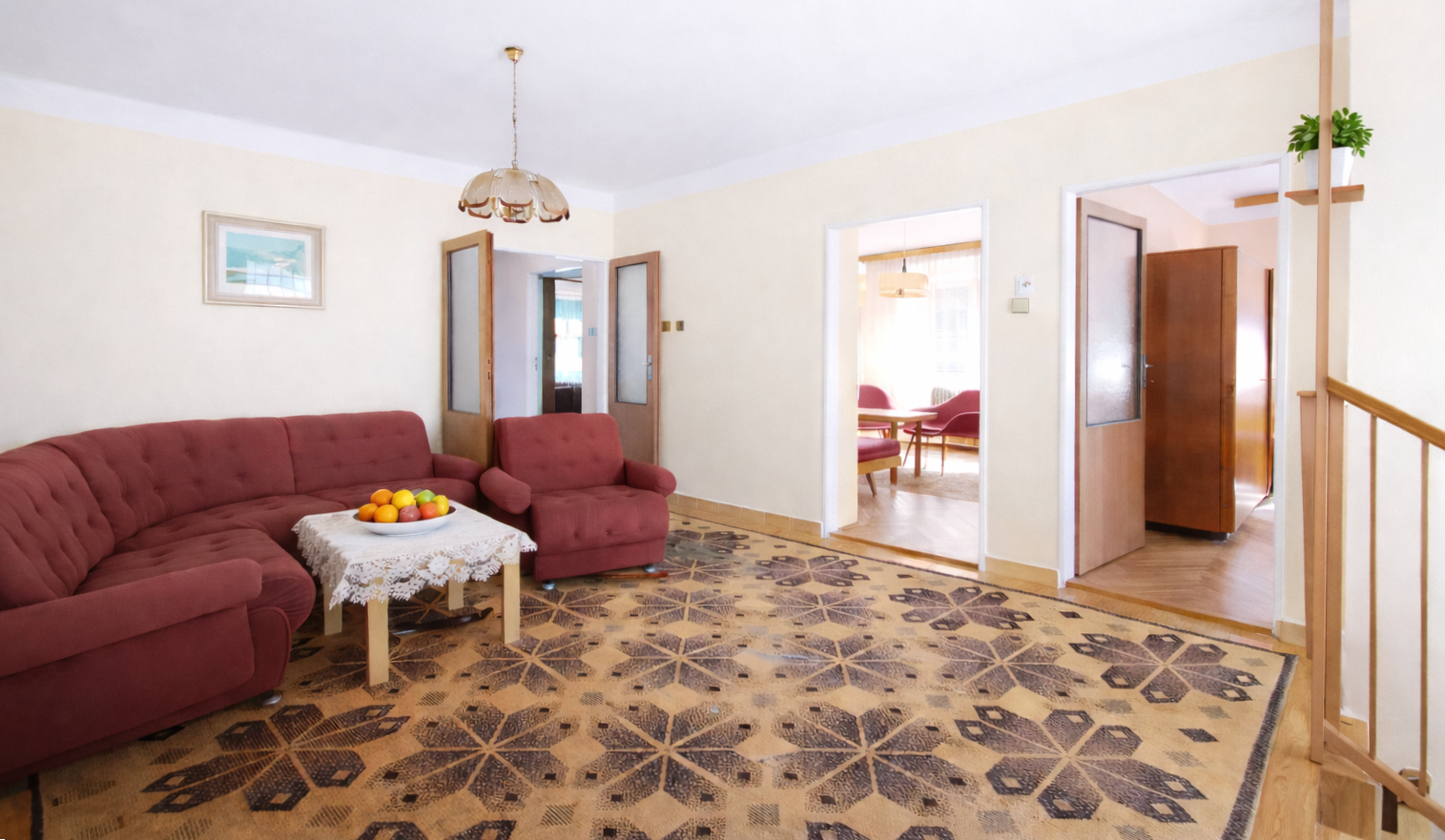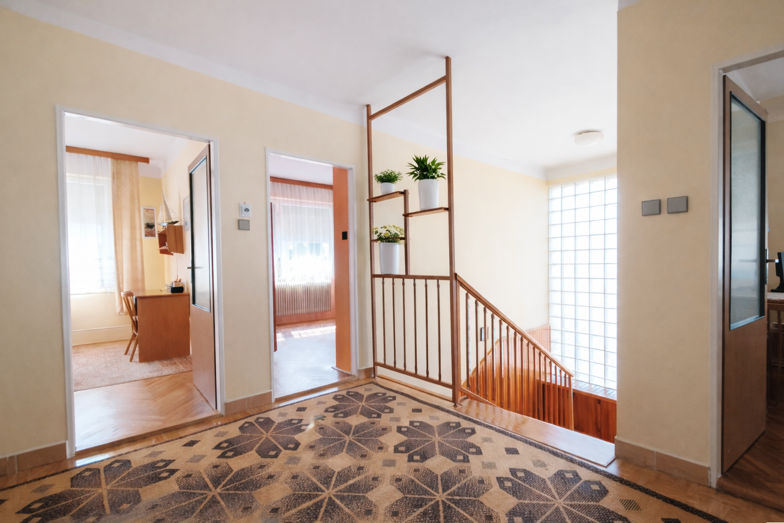 Interiér rodinného domu je v pôvodnom, veľmi dobrom technickom stave, čo umožňuje ideálnu príležitosť na okamžité bývanie a súčastne modernizáciu podľa vlastných predstáv. Zachované sú pôvodné prvky, ako drevené okná s vonkjšími žalúziami a interiérové dvere, drevené parkety v kombinácii s dlažbou, schodisko obložené drevom.